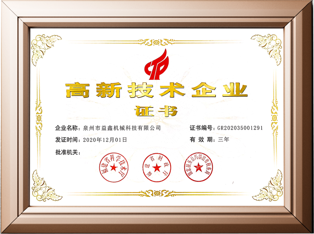 喜獲殊榮,泉州市益鑫機械科技有限公司(益鑫磚機)憑借雄厚的技術(shù)實力,專業(yè)的研發(fā)隊伍,持續(xù)不斷的創(chuàng)新能力,科學(xué)的企業(yè)管理,榮獲“國家高新技術(shù)企業(yè)”證書!這標(biāo)志著益鑫磚機在磚機制造科技創(chuàng)新能力上得到了國家層面的充分認(rèn)可與支持,由此正式邁入高新技術(shù)企業(yè)行列。